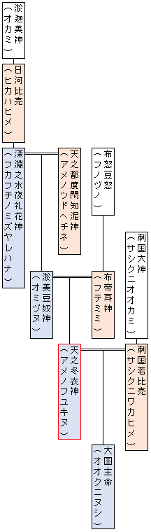 この図は、日本古来から出雲地方を統治してきた一族の家系図ですが、アマテラスオオミカミはアメノフユキヌと同じくらいの年代っぽいです。